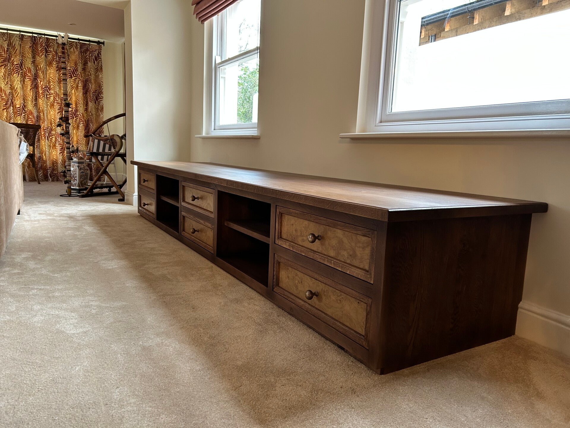 One of our proudest creations, this consol unit is a testament to meticulous craftsmanship. Fashioned from solid European oak with distinctive pippy oak veneer front panels, it perfectly blends robust structure with elegant detail. A true reflection of bespoke artistry.